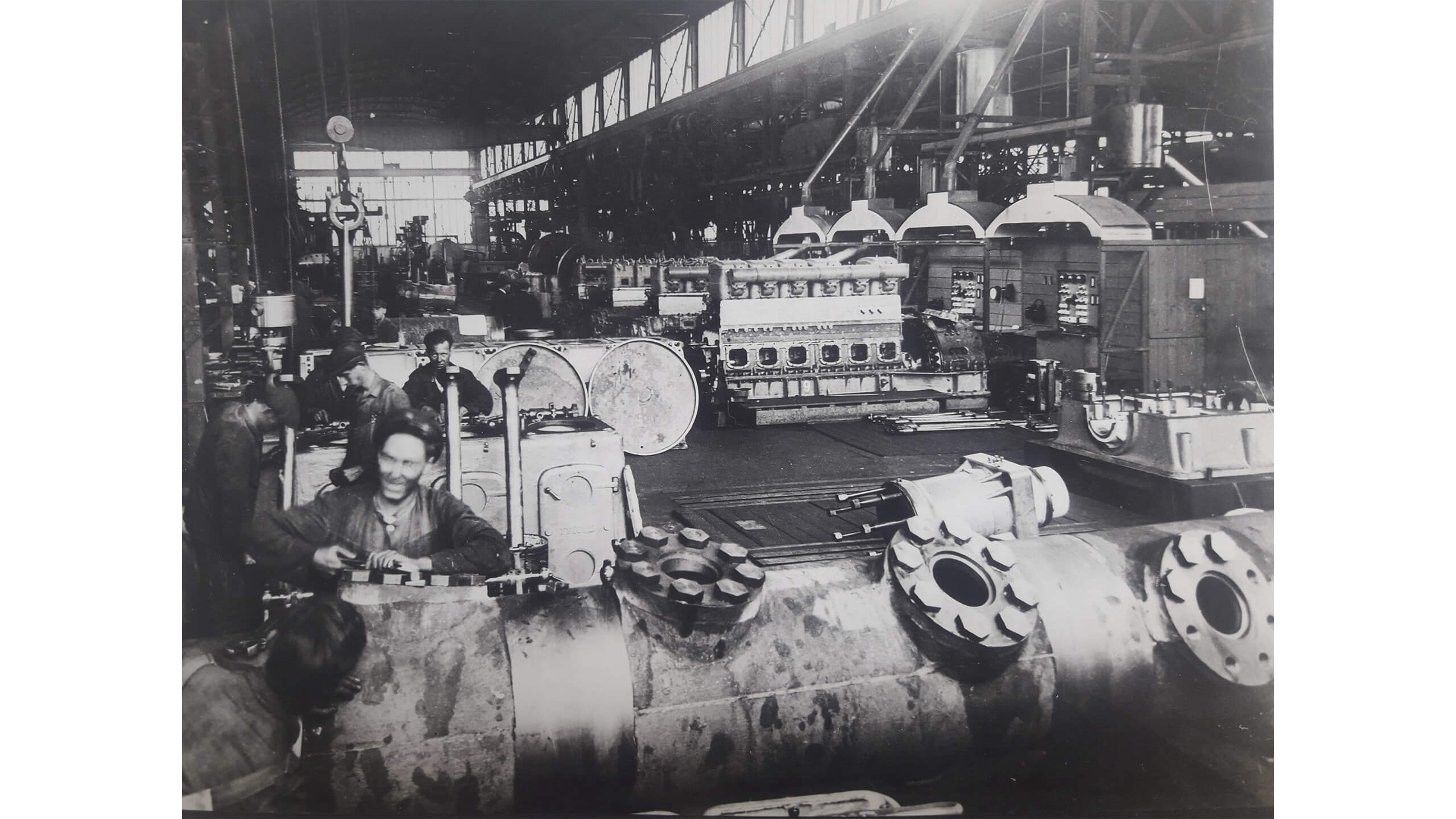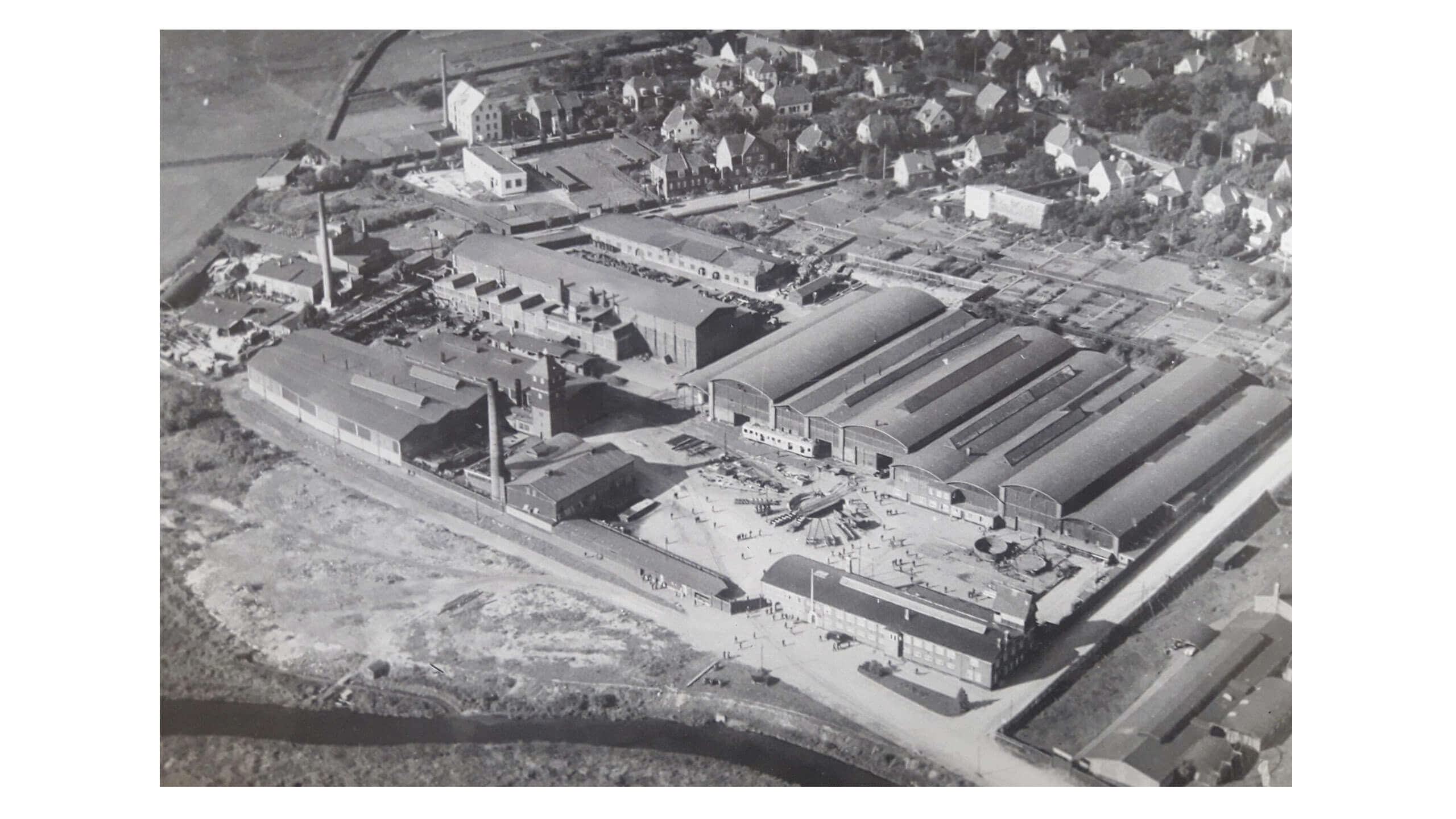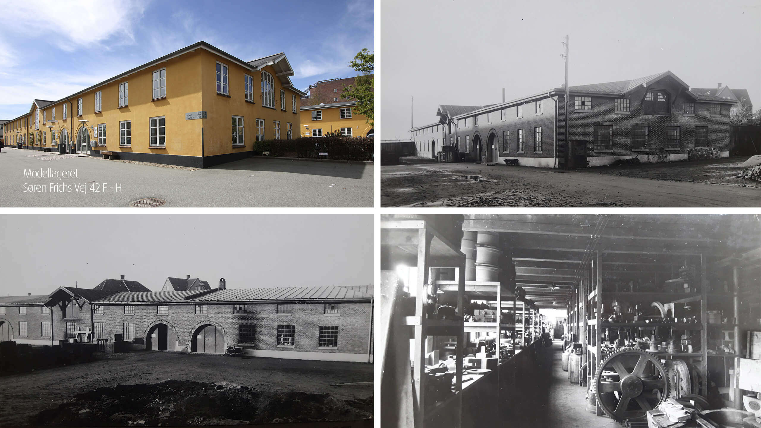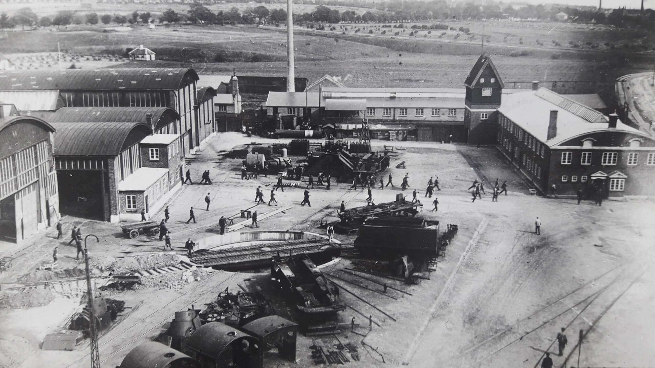 Sådan har det ikke altid set ud. Sort-hvide fotos fra en svunden tid viser, at her blev der bygget lokomotiver i røg og damp. Højloftede produktionshaller lagde hus til det grove arbejde såsom et støberi, en grovsmedje, et lokomotivværksted og et modellager.
