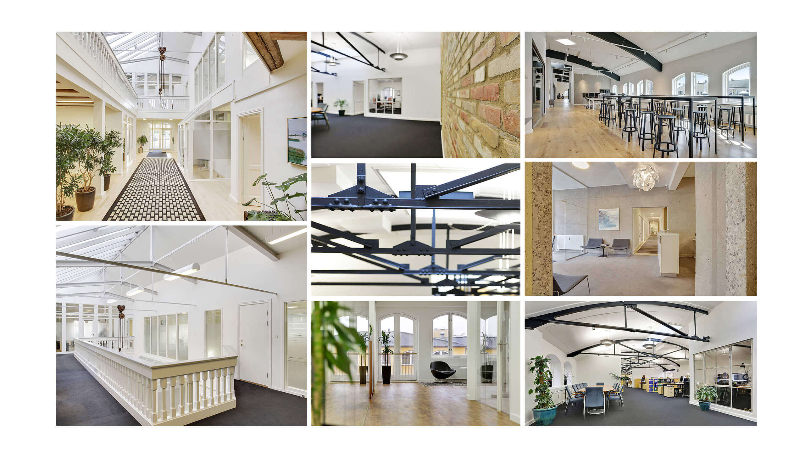 - I flere at de tidligere produktionshaller blev der etableret lysgårde i bygningernes kerne. Her var der plads til ophold, grønne planter, vandkunst samt lys og udkig fra høje vinduespartier.