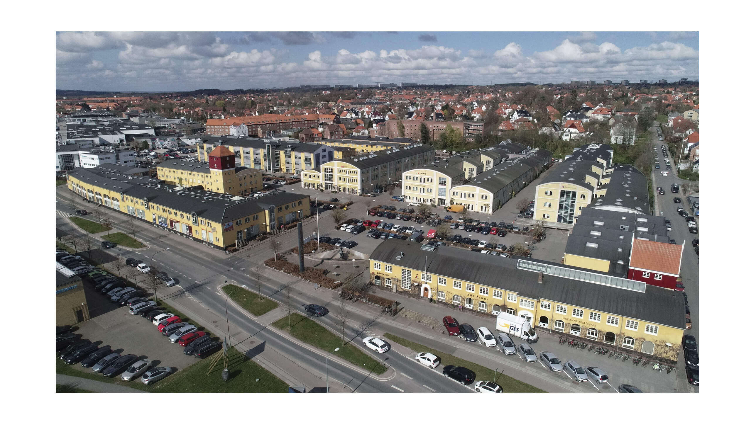 ”Planen var oprindelige, at der skulle være butikslejemål i gadeplan, hvor især de tidligere haller tillod, at stueetagen kunne bygges højere end de andre etager ovenover. Det blev aldrig til noget, for på det tidspunkt var det vanskeligt at flytte butikker herud, så vi endte med at sadle om og lavede stort set det hele til kontorlejemål”, fortæller Flemming Thygesen, og tilføjer, at der i dag findes andet end kontorlokaler i bygningerne, fx undervisningslokaler, butik og café.